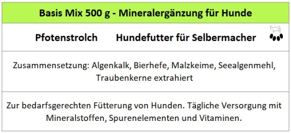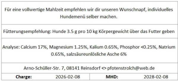 Der Basis Mix von Pfotenstrolch enthält nur natürliche Zutaten, wie Mineralien, Spurenelemente und Vitamine. Die hochwertigen Rohstoffe sind leicht verfügbare Mikronährstoffe, durch ihren pflanzlichen Ursprung werden die Entgiftungsorgane nicht weiter belastet. Eine optimale, naturbelassene Mikronährstoffversorgung mit Calcium, Magnesium, einem gesamten Komplex an lebensnotwendigen Spurenelementen und Alginaten wird somit ermöglicht.